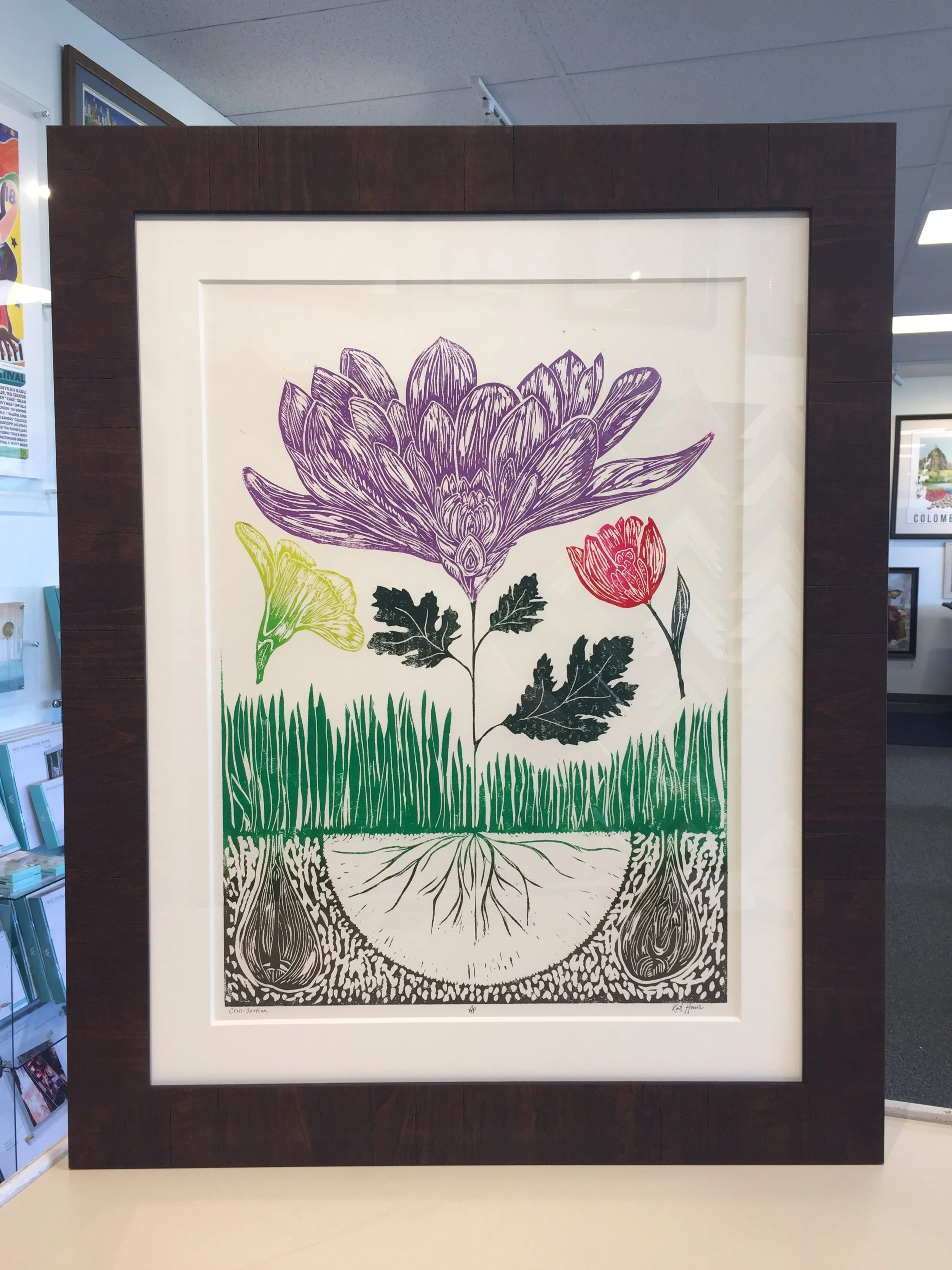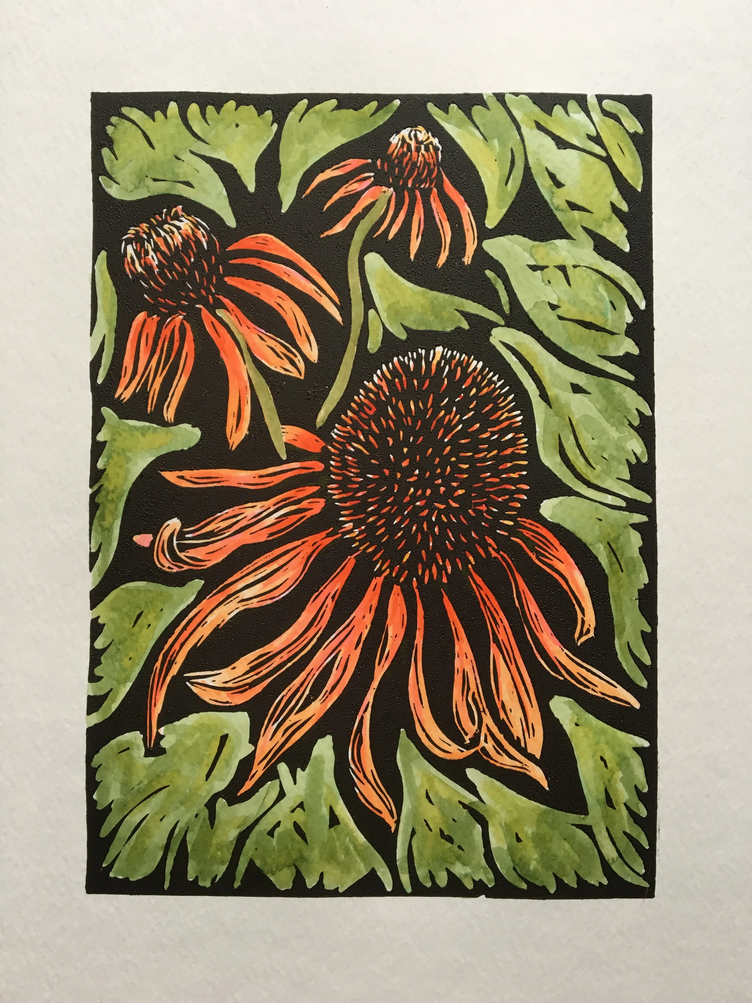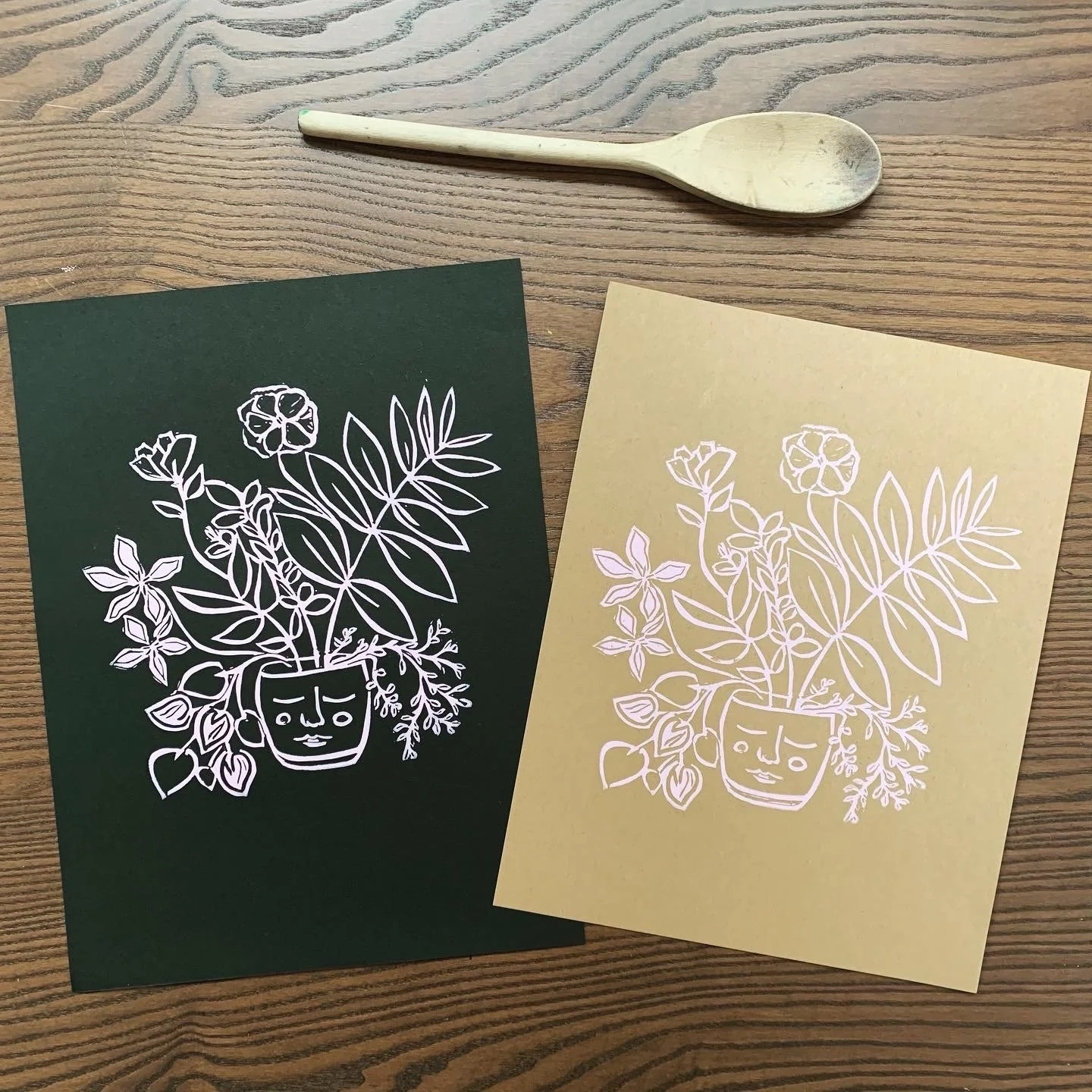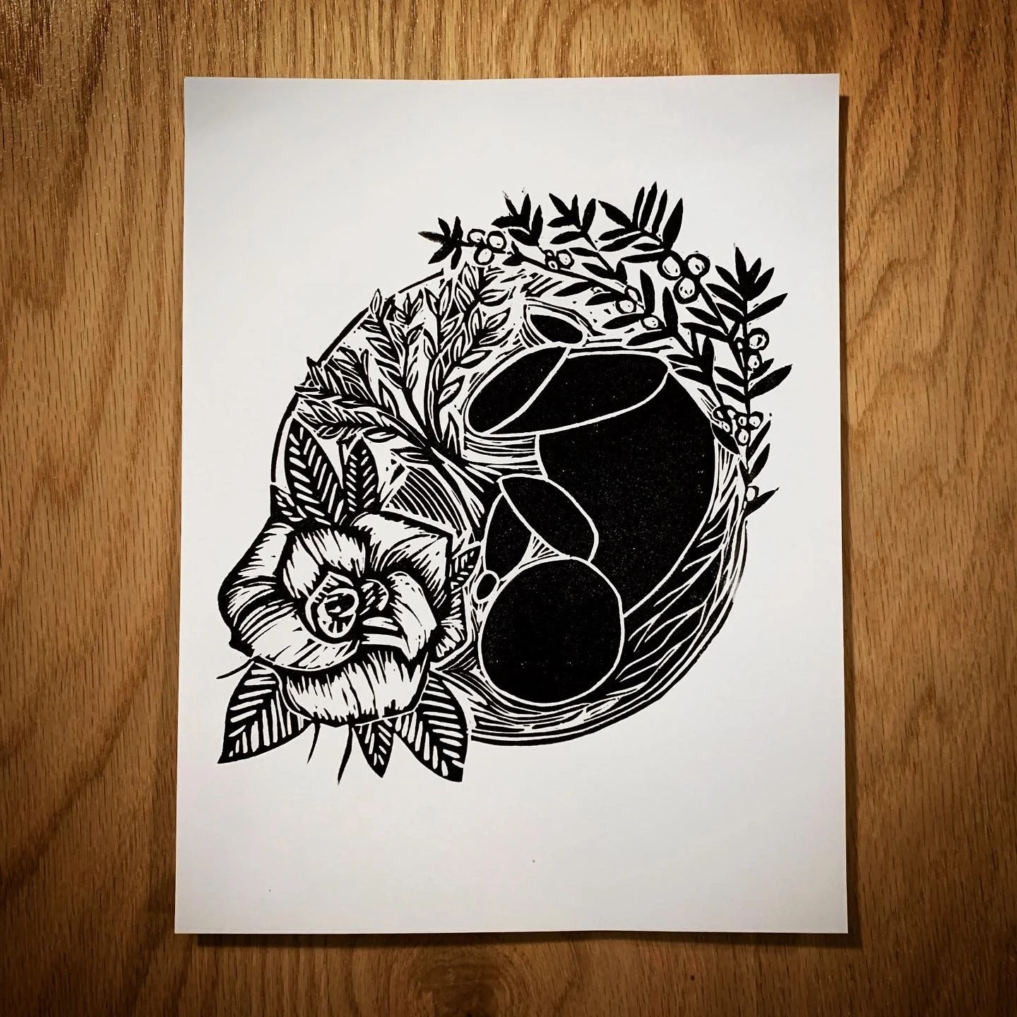 Relief Prints Each relief print is made from hand-carving a linoleum or speedy carve material. After carving, each block is inked and printed by hand.